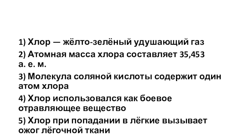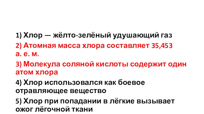 Слайд 401) Хлор — жёлто-зелёный удушающий газ