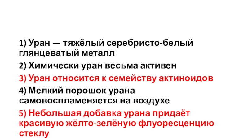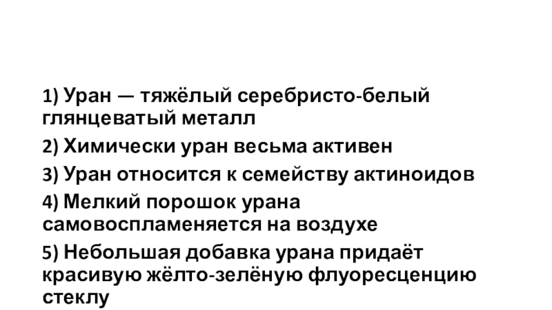 Слайд 341) Уран — тяжёлый серебристо-белый глянцеватый металл