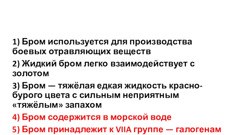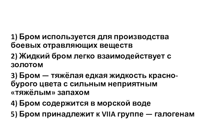 Слайд 51) Бром используется для производства боевых отравляющих веществ