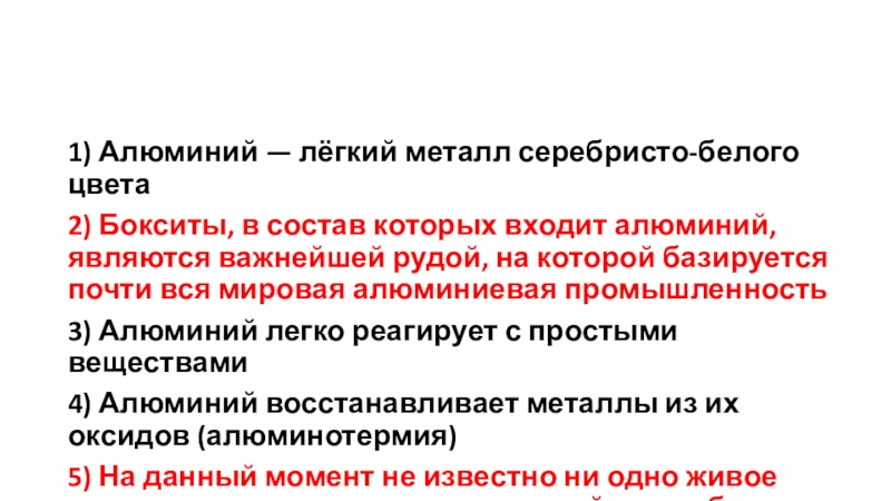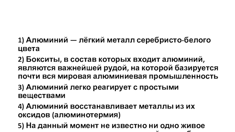 5) На данный момент не известно ни одно живое существо, использующее алюминий в метаболизме, — это «мёртвый» металл