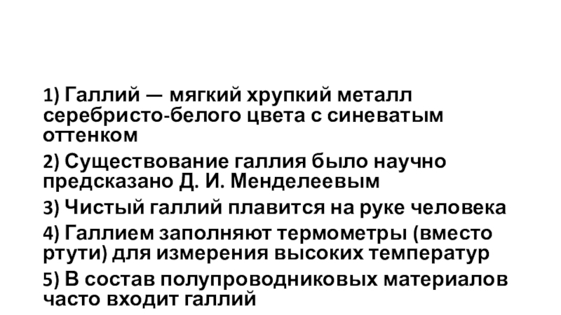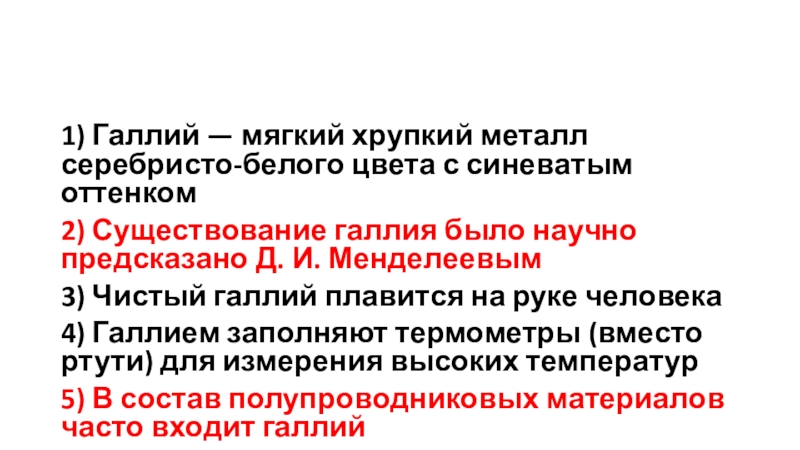 Слайд 391) Галлий — мягкий хрупкий металл серебристо-белого цвета с синеватым оттенком