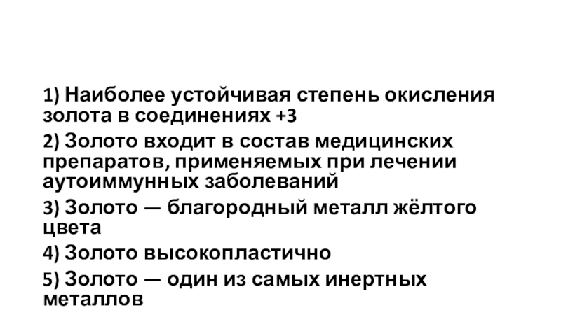Слайд 181) Наиболее устойчивая степень окисления золота в соединениях +3