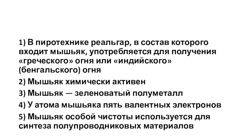 Слайд 211) В пиротехнике реальгар, в состав которого входит мышьяк, употребляется для