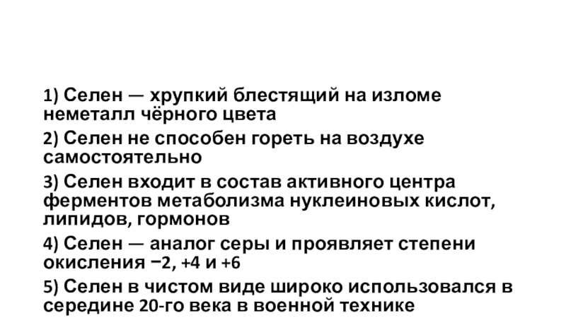 5) Селен в чистом виде широко использовался в середине 20-го века в военной технике