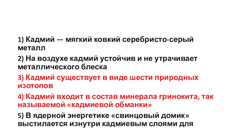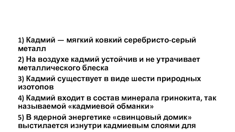 Слайд 421) Кадмий — мягкий ковкий серебристо-серый металл