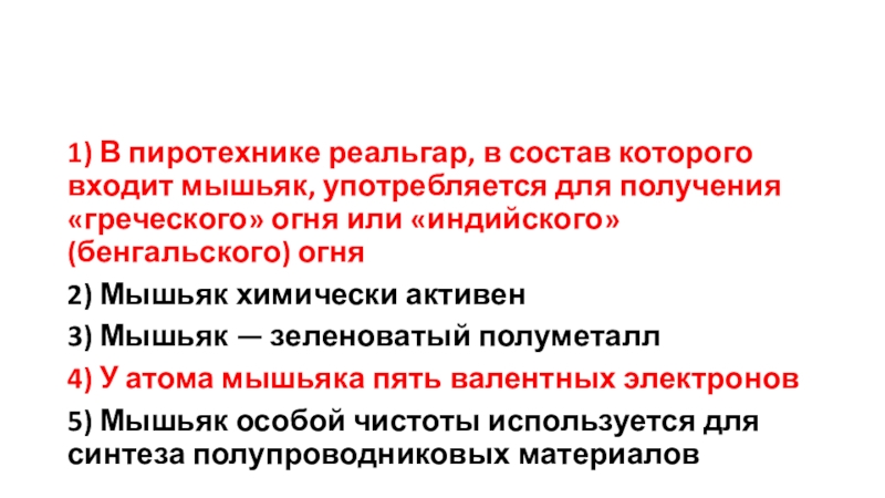 Слайд 201) В пиротехнике реальгар, в состав которого входит мышьяк, употребляется для