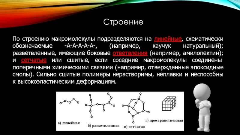 натуральный); разветвленные, имеющие боковые ответвления (например, амилопектин); и сетчатые или сшитые, если соседние макромолекулы соединены поперечными химическими связями (например, отвержденные эпоксидные смолы). Сильно сшитые полимеры нерастворимы, неплавки и неспособны к высокоэластическим деформациям.