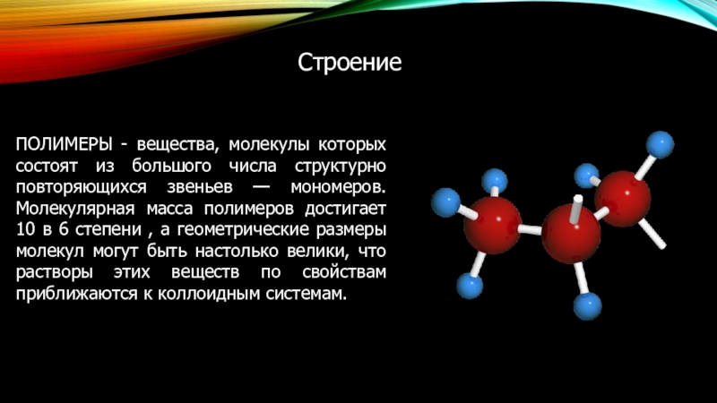 звеньев — мономеров. Молекулярная масса полимеров достигает 10 в 6 степени , а геометрические размеры молекул могут быть настолько велики, что растворы этих веществ по свойствам приближаются к коллоидным системам.