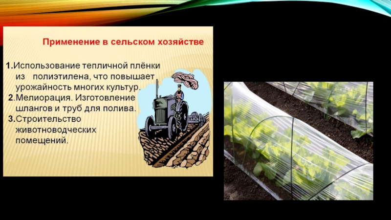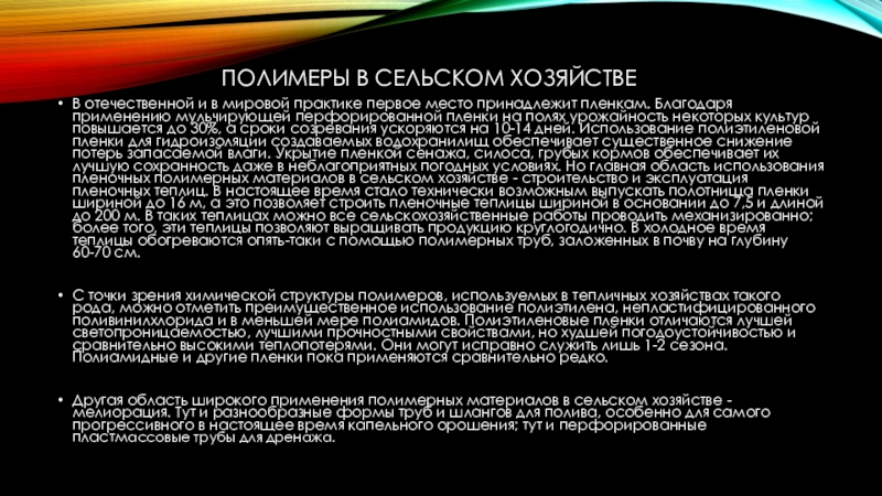 принадлежит пленкам. Благодаря применению мульчирующей перфорированной пленки на полях урожайность некоторых культур повышается до 30%, а сроки созревания ускоряются на 10-14 дней. Использование полиэтиленовой пленки для гидроизоляции создаваемых водохранилищ обеспечивает существенное снижение потерь запасаемой влаги. Укрытие пленкой сенажа, силоса, грубых кормов обеспечивает их лучшую сохранность даже в неблагоприятных погодных условиях. Но главная область использования пленочных полимерных материалов в сельском хозяйстве - строительство и эксплуатация пленочных теплиц. В настоящее время стало технически возможным выпускать полотнища пленки шириной до 16 м, а это позволяет строить пленочные теплицы шириной в основании до 7,5 и длиной до 200 м. В таких теплицах можно все сельскохозяйственные работы проводить механизированно; более того, эти теплицы позволяют выращивать продукцию круглогодично. В холодное время теплицы обогреваются опять-таки с помощью полимерных труб, заложенных в почву на глубину 60-70 см.