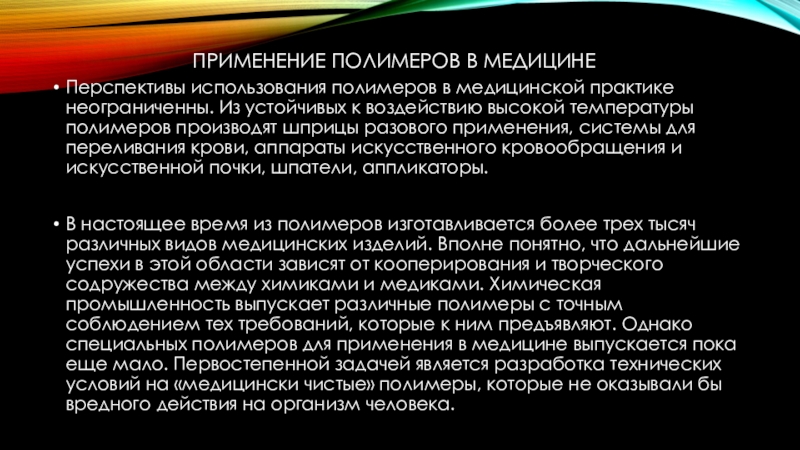 В настоящее время из полимеров изготавливается более трех тысяч различных видов медицинских изделий. Вполне понятно, что дальнейшие успехи в этой области зависят от кооперирования и творческого содружества между химиками и медиками. Химическая промышленность выпускает различные полимеры с точным соблюдением тех требований, которые к ним предъявляют. Однако специальных полимеров для применения в медицине выпускается пока еще мало. Первостепенной задачей является разработка технических условий на «медицински чистые» полимеры, которые не оказывали бы вредного действия на организм человека.