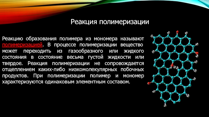 Слайд 6Реакцию образования полимера из мономера называют полимеризацией. В процессе полимеризации вещество