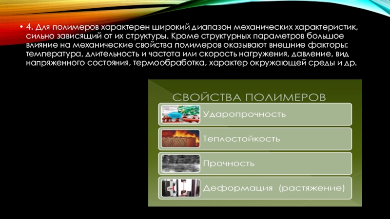Слайд 94. Для полимеров характерен широкий диапазон механических характеристик, сильно зависящий от