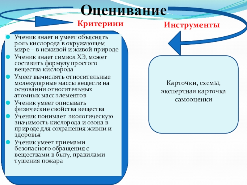 ОцениваниеКритериииИнструментыКарточки, схемы, экспертная карточка самооценкиУченик знает и умеет объяснять роль кислорода в окружающем мире – в неживой