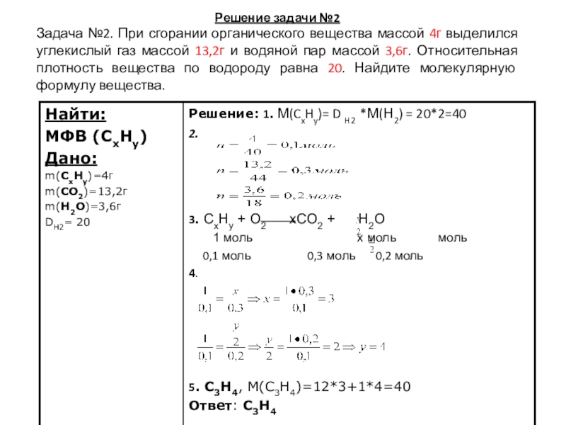 Задача №2. При сгорании органического вещества массой 4г выделился углекислый газ массой 13,2г и водяной пар массой 3,6г. Относительная плотность вещества по водороду равна 20. Найдите молекулярную формулу вещества.
