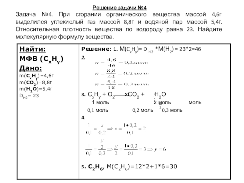 Задача №4. При сгорании органического вещества массой 4,6г выделился углекислый газ массой 8,8г и водяной пар массой 5,4г. Относительная плотность вещества по водороду равна 23. Найдите молекулярную формулу вещества.