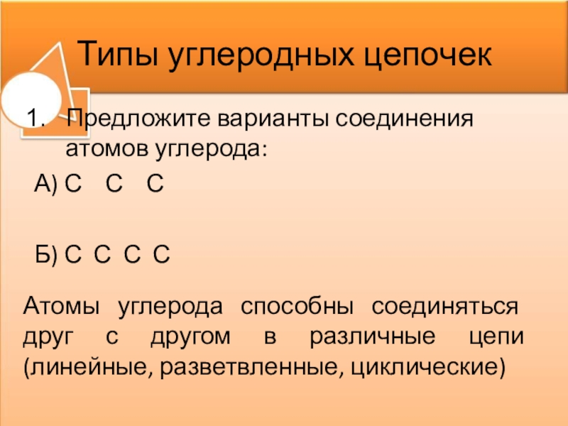 Атомы углерода способны соединяться друг с другом в различные цепи (линейные, разветвленные, циклические)