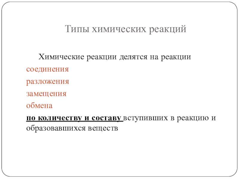 Типы химических реакций   Химические реакции делятся на реакциисоединенияразложениязамещенияобменапо количеству и составу вступивших в реакцию и
