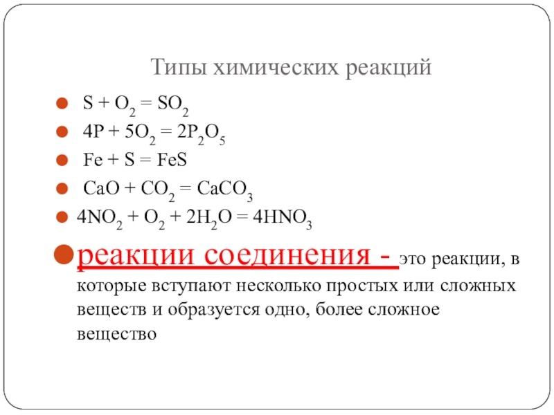 Типы химических реакций S + O2 = SO2 4P + 5O2 = 2P2O5 Fe + S = FeS CaO + CO2 = CaCO34NO2 + O2 + 2H2O = 4HNO3реакции соединения - это реакции, в которые вступают