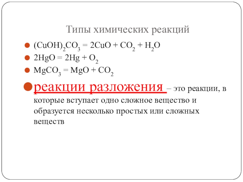 Типы химических реакций(CuOH)2CO3 = 2CuO + CO2 + H2O2HgO = 2Hg + O2MgCO3 = MgO + CO2реакции