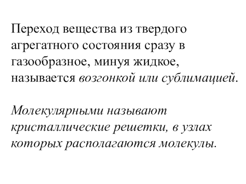 Переход вещества из твердого агрегатного состояния сразу в газообразное, минуя жидкое, называется возгонкой или сублимацией.Молекулярными называют кристаллические решетки,