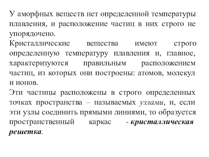 У аморфных веществ нет определенной температуры плавления, и расположение частиц в них строго не упорядочено.Кристаллические вещества имеют строго определенную температуру плавления и, главное, характеризуются правильным расположением частиц, из которых они построены: атомов, молекул и ионов. Эти