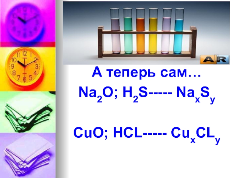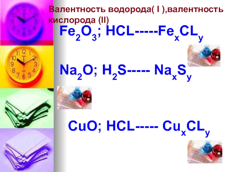 Валентность водорода( I ),валентность кислорода (II)Fe2O3; HCL-----FexCLyNa2O; H2S----- NaxSy CuO; HCL----- CuxCLy
