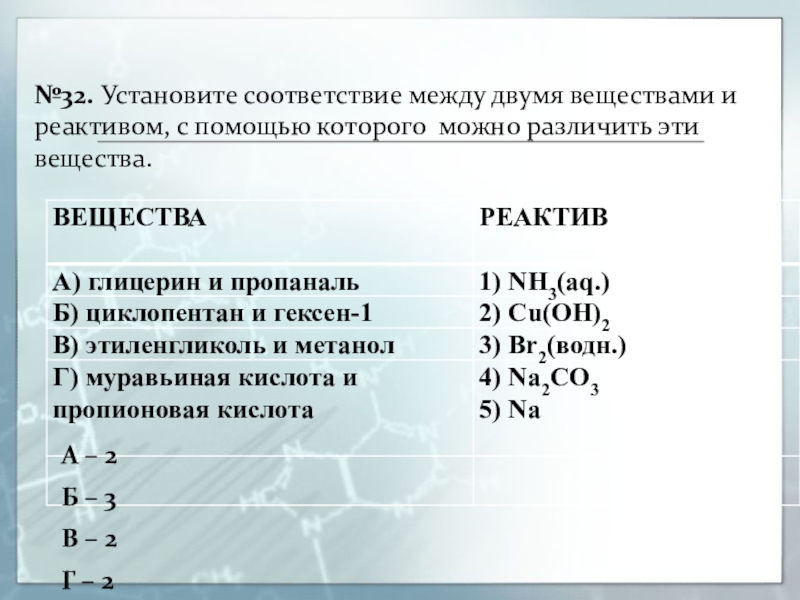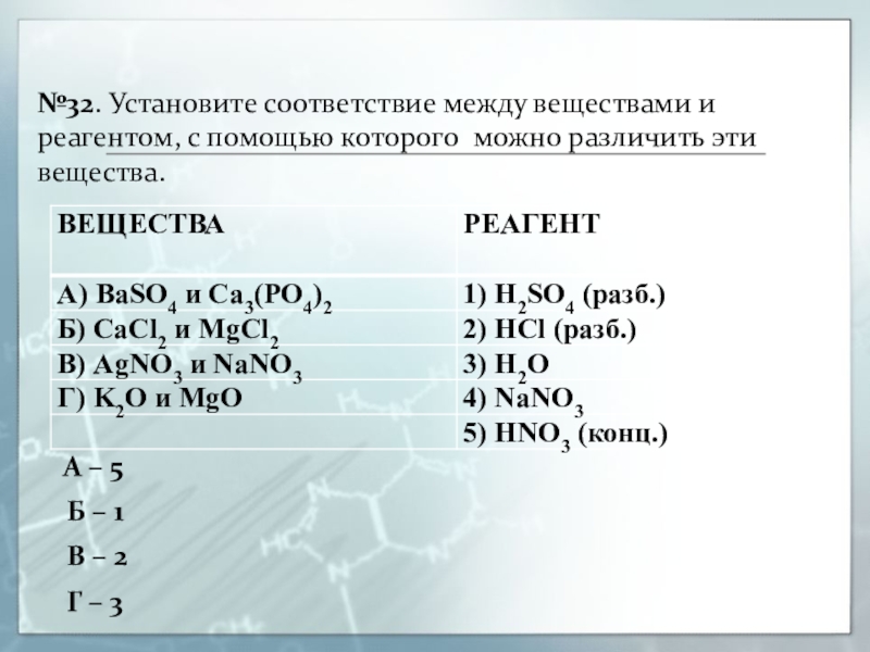 Слайд 28№32. Установите соответствие между реагирующими веществами и признаком реакции, которая протекает