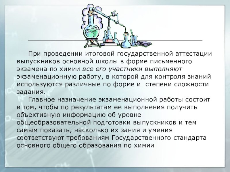 Главное назначение экзаменационной работы состоит в том, чтобы по результатам ее выполнения получить объективную информацию об уровне общеобразовательной подготовки выпускников и тем самым показать, насколько их зания и умения соответствуют требованиям Государственного стандарта основного общего образования по химии