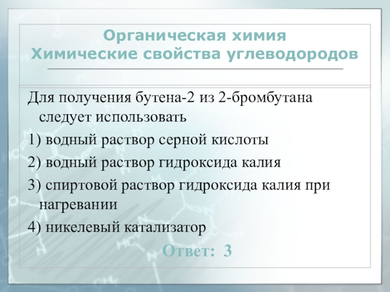 Для получения бутена-2 из 2-бромбутана следует использовать