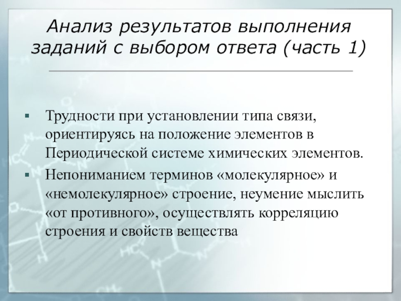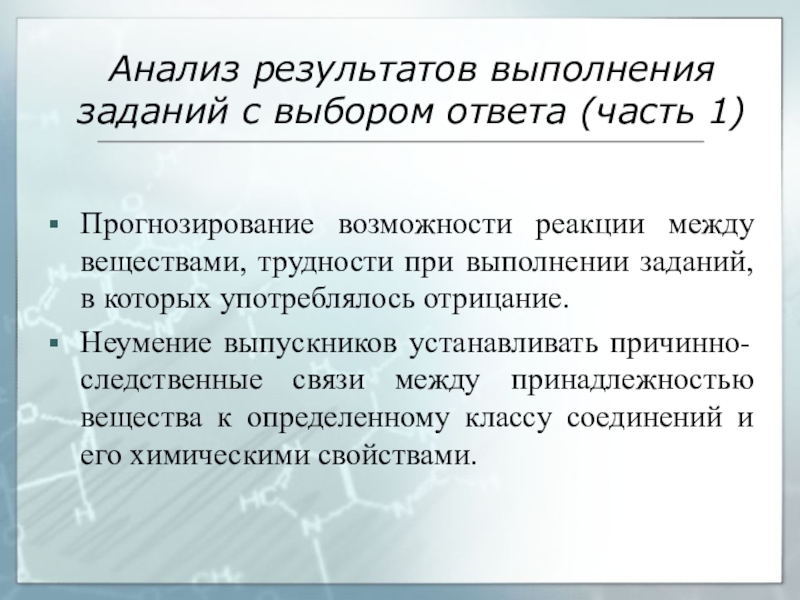 Слайд 9Анализ результатов выполнения заданий с выбором ответа (часть 1)