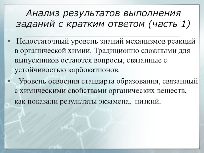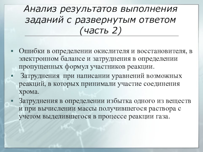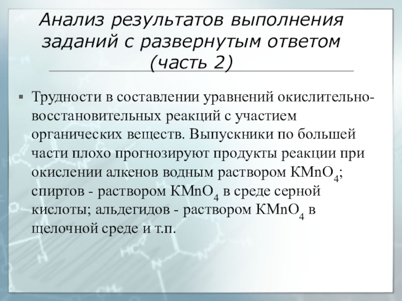 уравнений окислительно-восстановительных реакций с участием органических веществ. Выпускники по большей части плохо прогнозируют продукты реакции при окислении алкенов водным раствором КМnO4; спиртов - раствором КМnO4 в среде серной кислоты; альдегидов - раствором КМnO4 в щелочной среде и т.п.