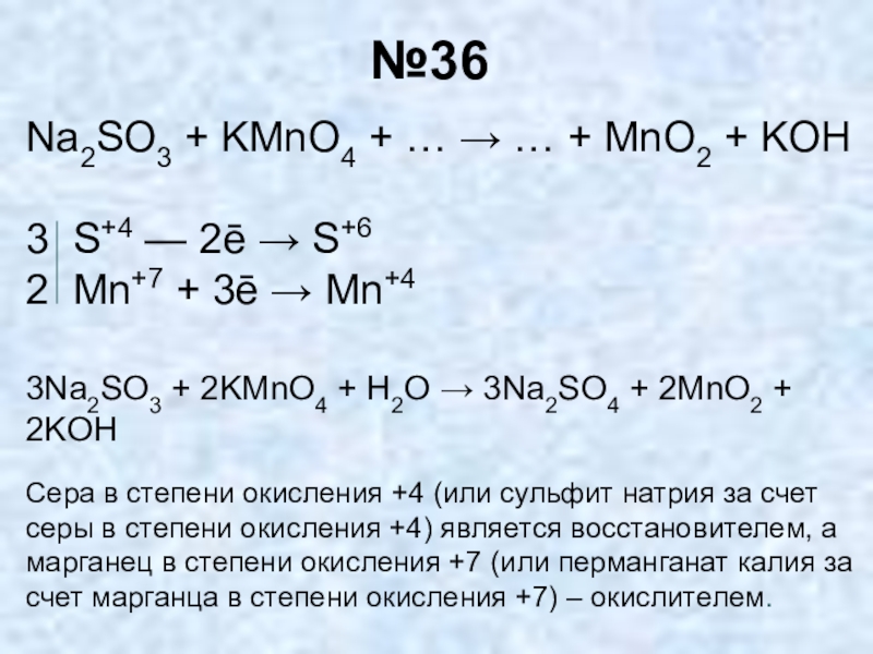 3Na2SO3 + 2KMnO4 + H2O → 3Na2SO4 + 2MnO2 + 2KOH
