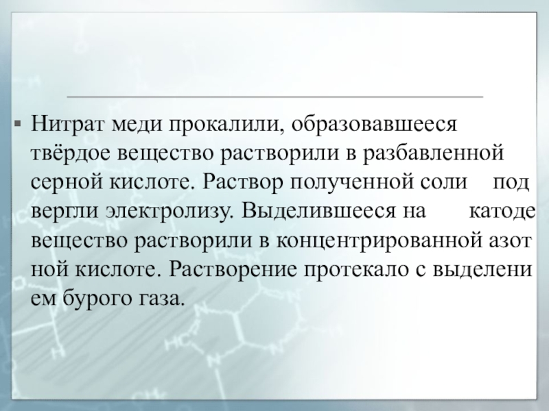 Раствор полученной соли подвергли электролизу. Выделившееся на катоде вещество растворили в концентрированной азотной кислоте. Растворение протекало с выделением бурого газа.