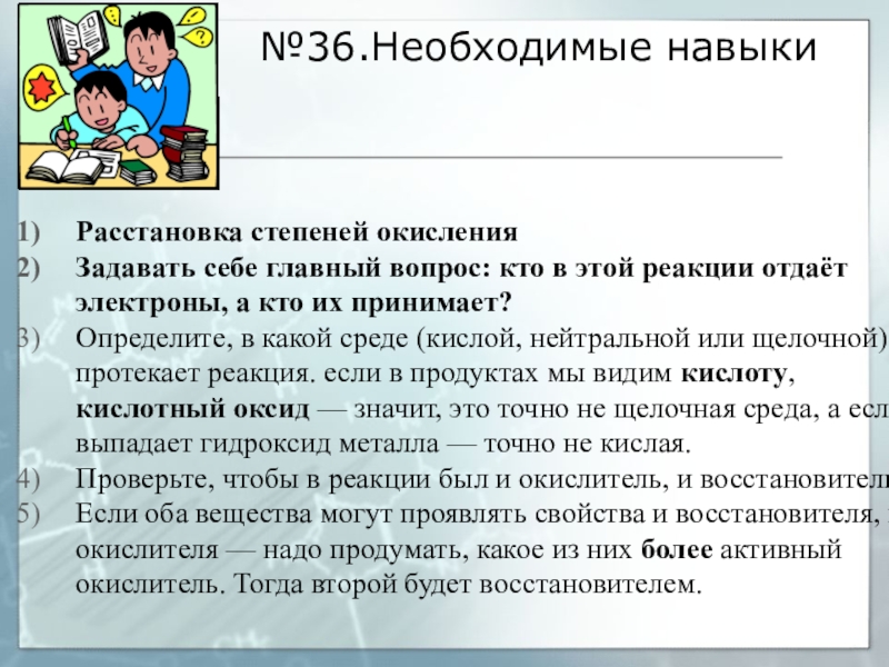 Определите, в какой среде (кислой, нейтральной или щелочной) протекает реакция. если в продуктах мы видим кислоту, кислотный оксид — значит, это точно не щелочная среда, а если выпадает гидроксид металла — точно не кислая.