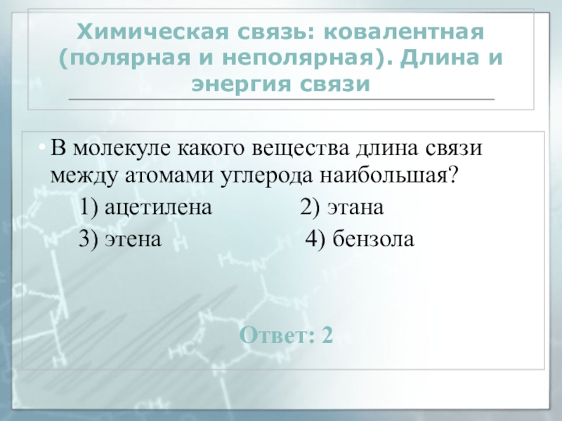 Химическая связь: ковалентная (полярная и неполярная). Длина и энергия связи