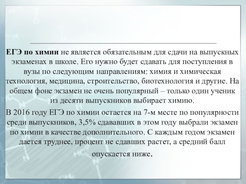 школе. Его нужно будет сдавать для поступления в вузы по следующим направлениям: химия и химическая технология, медицина, строительство, биотехнология и другие. На общем фоне экзамен не очень популярный – только один ученик из десяти выпускников выбирает химию.