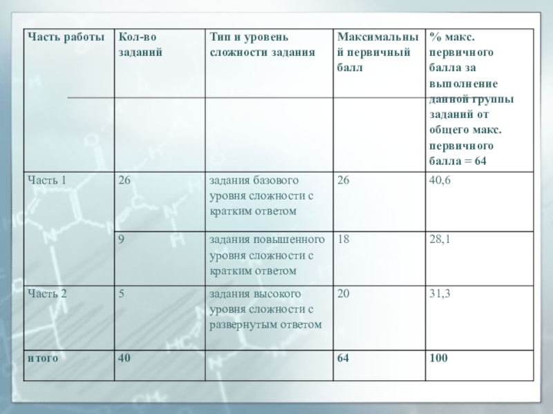 экзамена по химии все его участники выполняют экзаменационную работу, в которой для контроля знаний используются различные по форме и степени сложности задания.