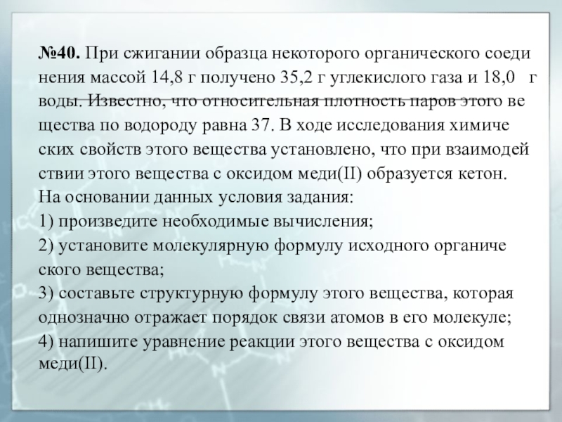 Слайд 57№40. При сжигании образца некоторого органического соединения массой 14,8 г получено