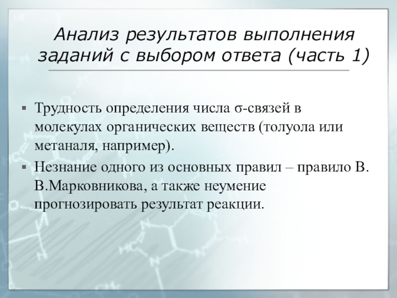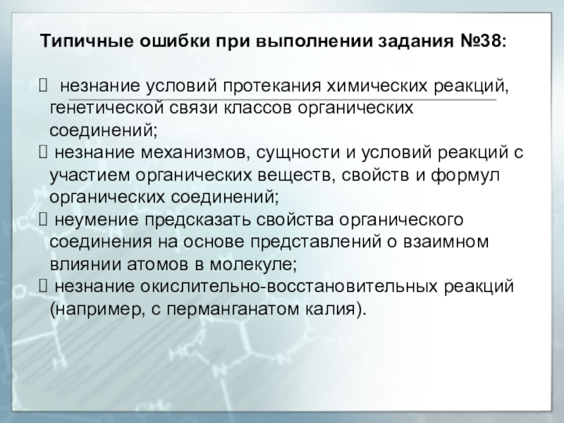 незнание механизмов, сущности и условий реакций с участием органических веществ, свойств и формул органических соединений;