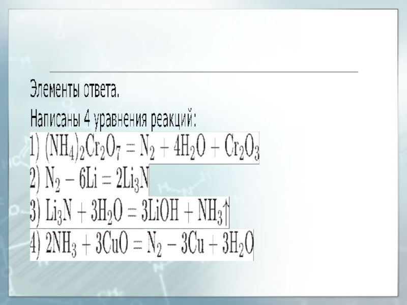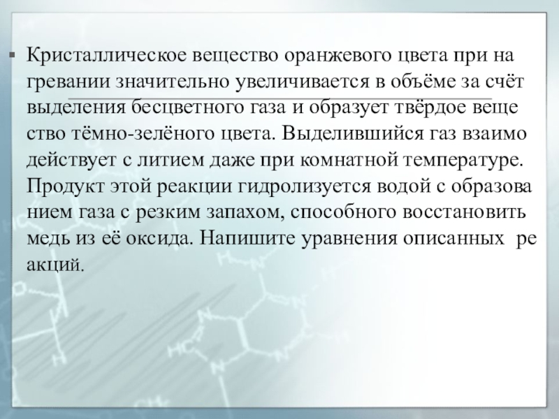 счёт выделения бесцветного газа и образует твёрдое вещество тёмно-зелёного цвета. Выделившийся газ взаимодействует с литием даже при комнатной температуре. Продукт этой реакции гидролизуется водой с образованием газа с резким запахом, способного восстановить медь из её оксида. Напишите уравнения описанных реакций.