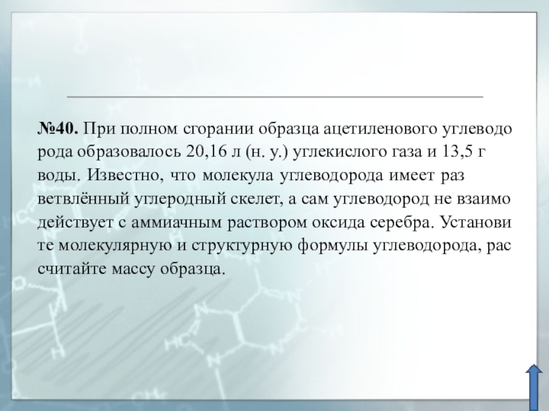 №40. При полном сгорании образца ацетиленового углеводорода образовалось 20,16 л
