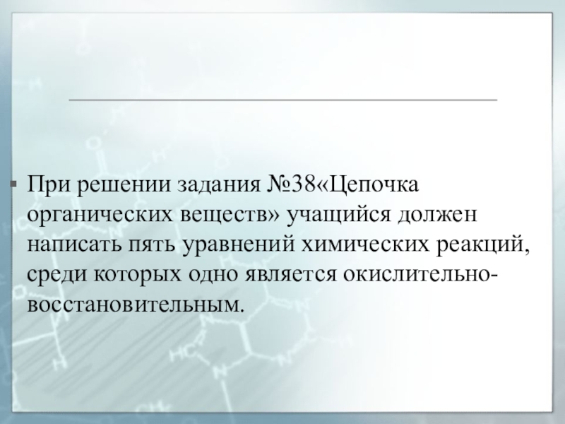 При решении задания №38«Цепочка органических веществ» учащийся должен написать пять уравнений