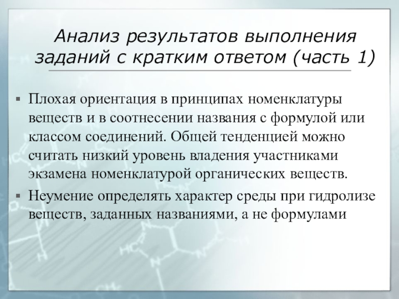 принципах номенклатуры веществ и в соотнесении названия с формулой или классом соединений. Общей тенденцией можно считать низкий уровень владения участниками экзамена номенклатурой органических веществ.