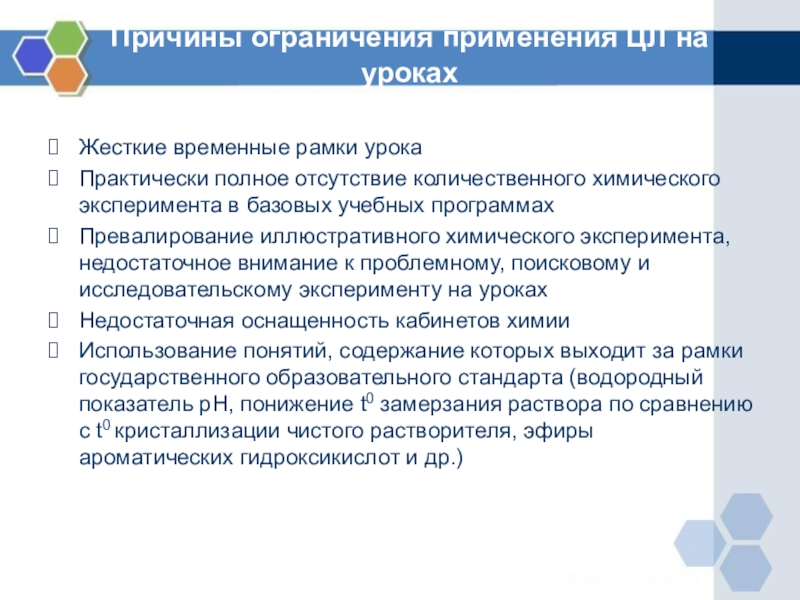 Причины ограничения применения ЦЛ на урокахЖесткие временные рамки урокаПрактически полное отсутствие количественного химического эксперимента в базовых учебных