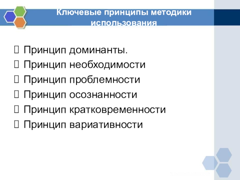 Ключевые принципы методики использованияПринцип доминанты.Принцип необходимостиПринцип проблемностиПринцип осознанностиПринцип кратковременностиПринцип вариативности