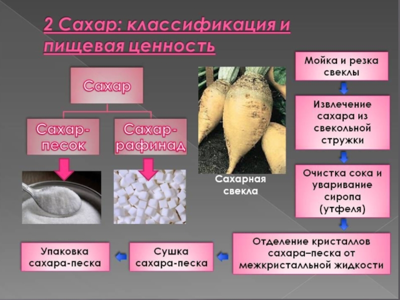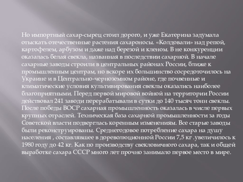 растения сахароносы. «Колдовали» над репой, картофелем, арбузом и даже над березой и кленом. В не конкуренции оказалась белая свекла, названная в последствии сахарной. В начале сахарные заводы строили в центральных районах России, ближе к промышленным центрам, но вскоре их большинство сосредоточилось на Украине и в Центрально-черноземном районе, где почвенные и климатические условия культивирования свеклы оказались наиболее благоприятными. Перед первой мировой войной на территории России действовал 241 заводи перерабатывали в сутки до 140 тысяч тонн свеклы. После победы ВОСР сахарная промышленность оказалась в числе первых крупных отраслей. Техническая база сахарной промышленности за годы Советской власти подверглась коренным изменениям. Все старые заводы были реконструированы. Среднегодовое потребление сахара на душу населения , составлявшее в дореволюционной России 7,5 кг .увеличилось к 1980 году до 42 кг. Как по производству свекловичного сахара, так и общей выработке сахара СССР много лет прочно занимало первое место в мире.