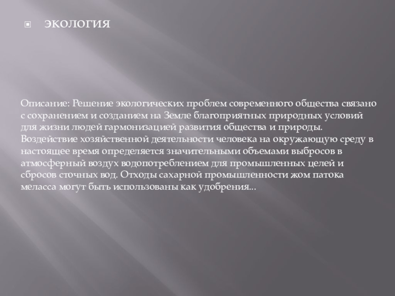 экологияОписание: Решение экологических проблем современного общества связано с сохранением и созданием на Земле благоприятных природных условий для