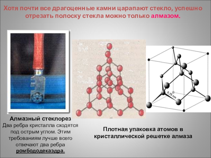 Алмазный стеклорез Два ребра кристалла сходятся под острым углом. Этим требованиям лучше всего отвечают два ребра ромбододекаэдра.