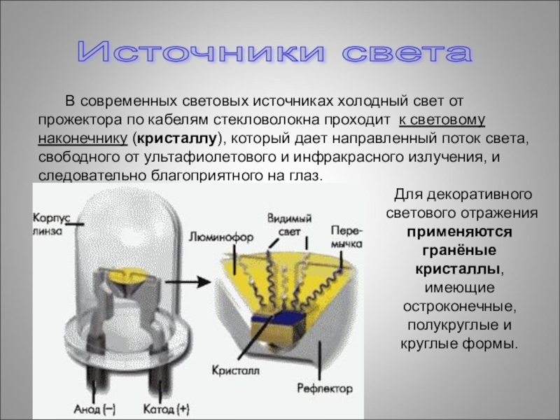 В современных световых источниках холодный свет от прожектора по кабелям стекловолокна проходит к световому наконечнику (кристаллу), который дает направленный поток света, свободного от ультафиолетового и инфракрасного излучения, и следовательно благоприятного на глаз.