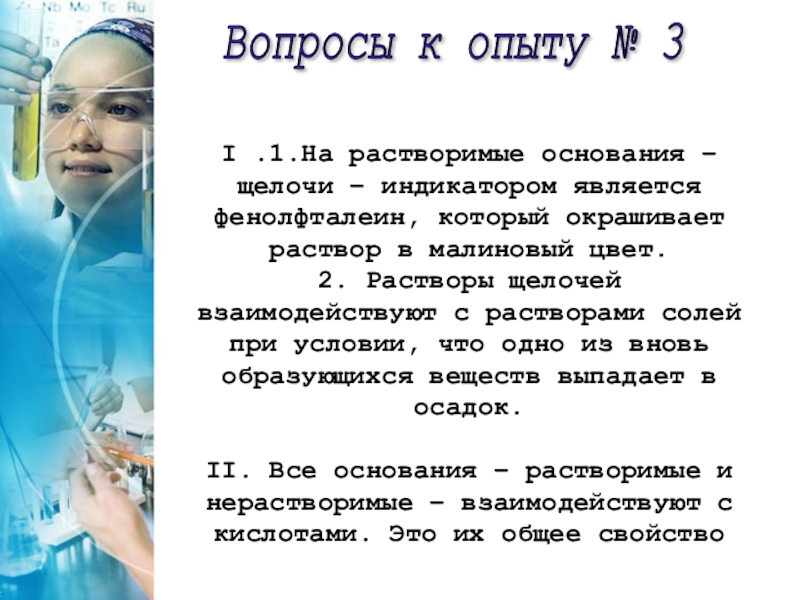 I .1.На растворимые основания – щелочи – индикатором является фенолфталеин, который окрашивает раствор в малиновый цвет.